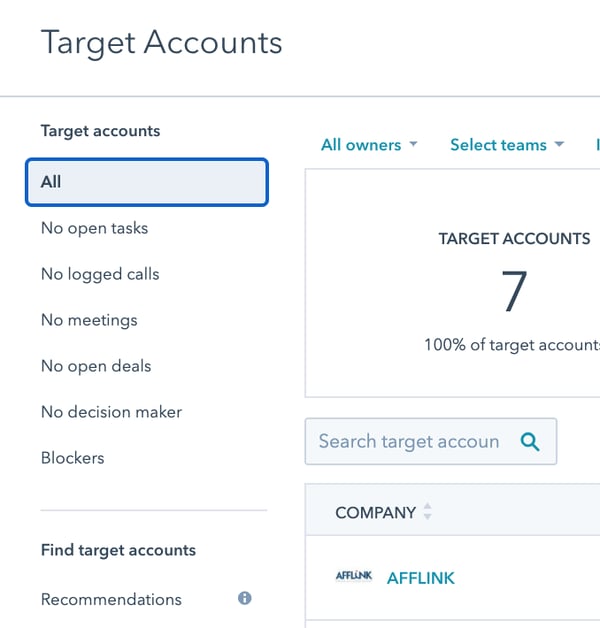 The Target Account dashboard is most valuable when you are also leveraging the HubSpot CRM, because you’ll be able to see associated activities from both a sales and marketing perspective and also segment your target accounts based on CRM activities such as open tasks.