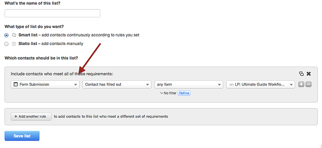 1. Make a Smart list: In your List tool, create a Smart list that will trigger the workflow. You may need to create multiple lists for the different types of notifications. For example, your demo form may send a notification to a different sales person than your contact forms, so you will need seperate lists.