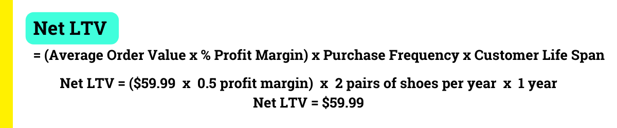 Using the same shoe store example and variables above, let’s calculate the net LTV of a customer segment that buys, on average, two pairs of shoes per purchase, makes that purchase once per year, and remains a customer for one year.