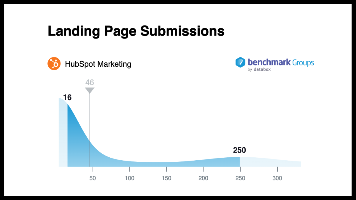 Our participants average 46 landing page submissions per month, while the top-performing companies in our benchmark group achieve submissions in the hundreds. Since this metric is a raw number, not a conversion rate, the best way to gauge your performance is to compare your percentile ranking in landing page submissions to your percentile ranking in sessions.