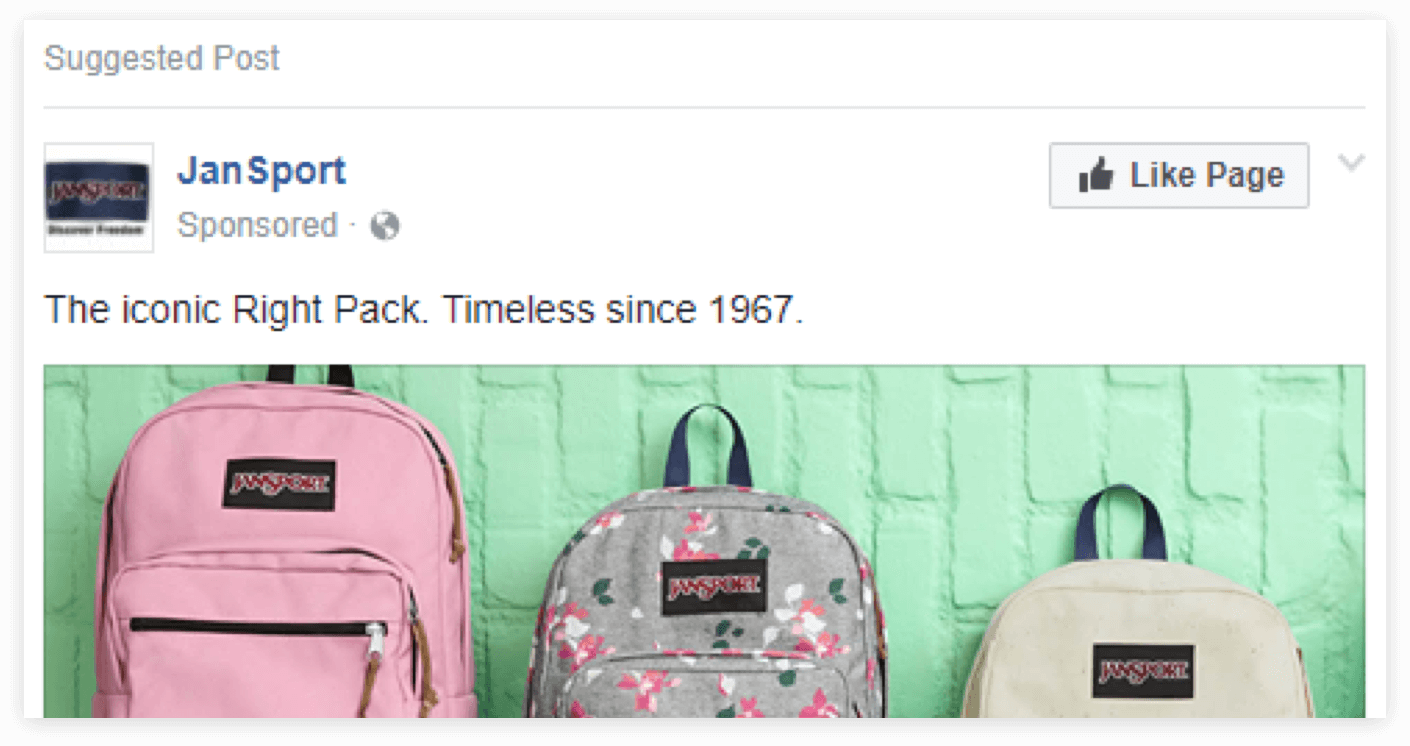 - Facebook offers an ad product for every marketing goal and business opportunity; you can explore these in Facebook’s Ads Guide. Below, you can see an example of a native ad paired with some ads in the right rail. All of these are focusing on website clicks as the goal. As you can see, the ad space is not disruptive at all and provides a great experience to the user.