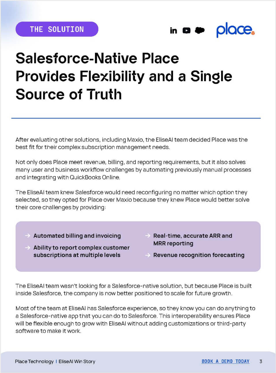 Place Technology is a Texas-based B2B SaaS company with a signature solution built directly in Salesforce. The company provides a RevOps solution that assists with subscription management, revenue, billing, forecasting, planning, metrics, and analysis—all designed to help companies scale profitably and efficiently.